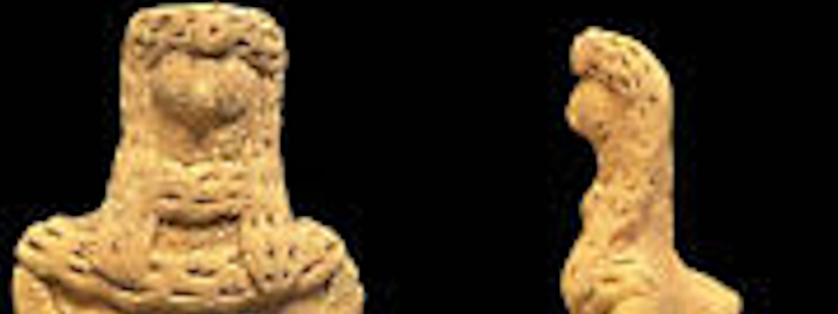 The long and highly stylized hairdos are characteristic of many figures and monumental statues of the period. Statues of men often featured heavy, braided beards as well as long curled hair. The lack of facial hair and the feminine features show this to be a representation of female figures, though the lack of any jewelry needs to be noted. Many figures of various goddess of this and other periods are frequently heavily bedecked with jewels. See the plaque image of the great goddess Inanna, No. 222 in the collection which shows the goddess with 24 necklaces of ascending size as well as other jewelry.